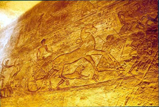 Ramsès II sur son char de bataille, accompagné de son lion.