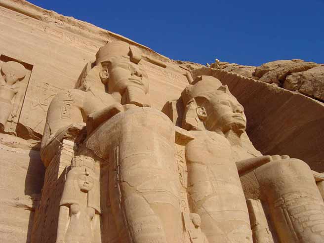 Quatre statues colossales, placées sur une terrasse, hautes de 20 mètres représentent le pharaon Ramsès II, assis sur un trône.