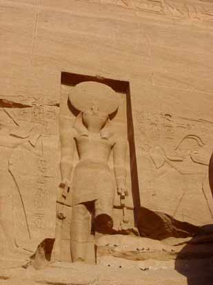 Au-dessus de la porte d'entrée, haute et étroite, on voit, au milieu de la façade, une niche avec l'image de Ramsès-Soleil, torse nu, semblant surgir de la niche, comme une apparition. Sa tête de faucon est dominée par le globe de Rê, disque solaire. Le dieu tient dans la main gauche un sceptre à tête de chien-Ouser; de l'autre, il s'appuie sur l'image accroupie de Maât représentant l'équilibre cosmique. Ces deux figurations, jointes au disque solaire Rê, forment un jeu d'écriture, même rébus qui constitue le nom de Ramsès, Ouser-Maât-Rê, "puissante est l'énergie du Soleil". Le pharaon apparaît ici comme la figure centrale du temple, en quelque sorte sa divinité principale.